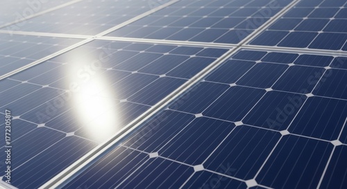 Closeup view of a solar panel array, showcasing the intricate grid pattern and reflective surface under natural light, symbolizing renewable energy and sustainability