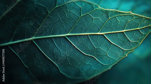 Close-up view of a teal leaf's intricate vein structure.