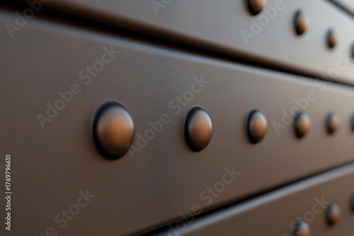 Close-up view of a textured metal surface secured with rows of evenly spaced rivets, highlighted by a play of light and shadow accentuating the industrial aesthetic.
