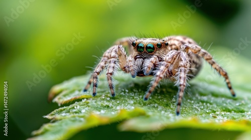 Close-up view of a vibrant jumping spider with iridescent green eyes perched on a dew-covered leaf in a lush green garden. : Generative AI