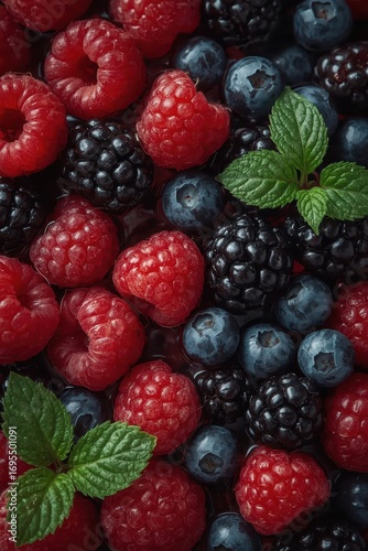 Close-up view of a vibrant mix of fresh raspberries, blueberries, and blackberries, with vibrant colors and a healthy appearance.