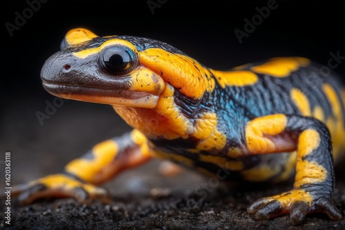 Close-up view of a vibrant salamander with yellow and black patterns in a natural habitat during the daytime