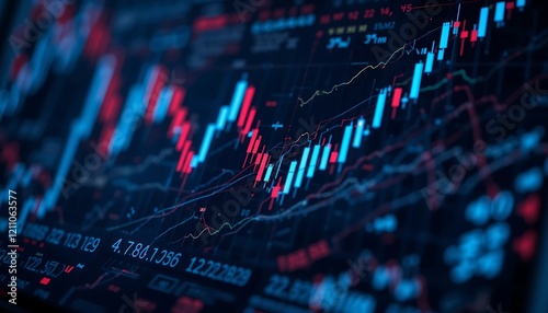 Close-up view of a vibrant stock market chart displaying dynamic candlestick patterns, intricate lines, and numerical data on a dark background.