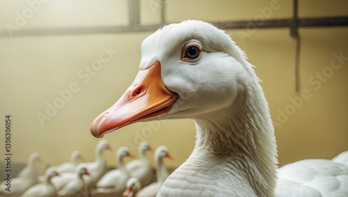 Close-up view of a white goose featuring an orange beak, set against a soft yellow backdrop. Poultry captured in detail on a farming operation. Business focused on duck and goose breeding. Space av...