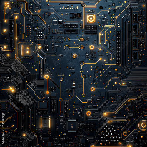 Close-up view of an enhanced electronic circuit board, showcasing ICs, capacitors, resistors, and other discrete components The image uses light effects for aesthetic illumination, hig - AI-Generated