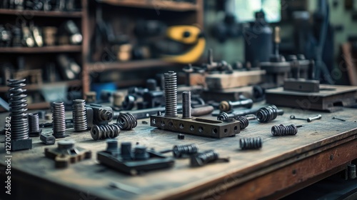 Close-up view of an industrial workshop workbench with metal springs and various tools, emphasizing the craftsmanship and intricate details of mechanical components.