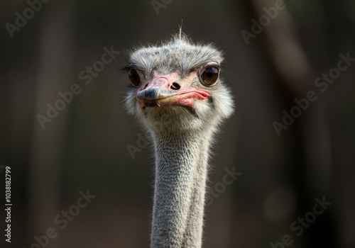 Close-up view of an ostrich in a natural habitat showcasing its distinctive features during a sunny afternoon