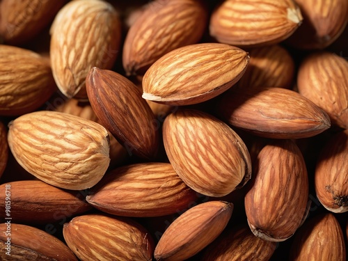 Close-up view of assorted raw almonds in various shades and sizes arranged on a dark surface