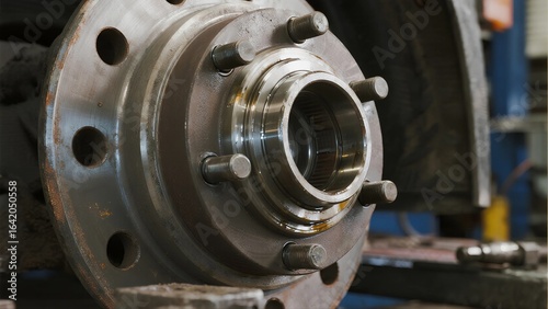 Close-up view of car hub assembly with bolts and metal components