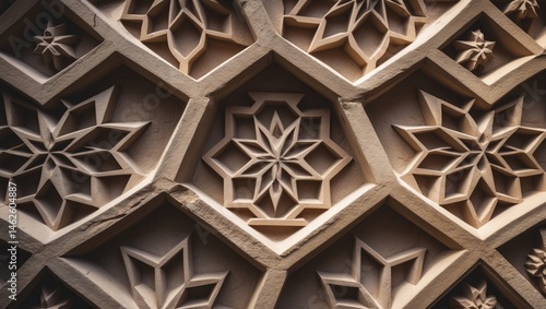 Close-up view of carved sandstone wall featuring detailed geometric designs