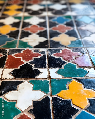 Close-up view of colorful, geometric patterned tiles. The intricate design features a variety of colors, creating a visually striking surface.