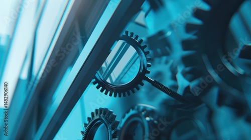 Close-up view of complex mechanical gears, showcasing their intricate design. Gears interact with precision