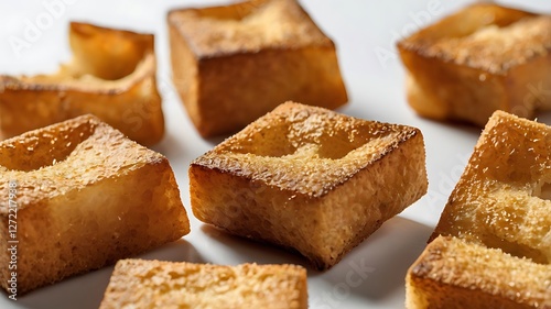 Closeup view of crispy croutons arranged on a tabletop surface