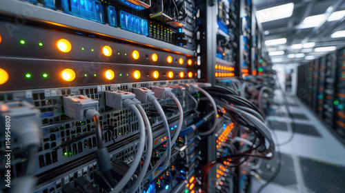 Close-Up View of Data Center Server Rack Displaying Network Switches, Fiber Connections, and Illuminated Lights in a Modern Technology Environment