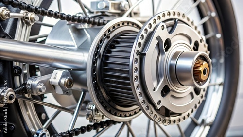 Close-up view of DC motor and gearbox in an electric bicycle frame, bicycle mechanical part, electric bike motor components