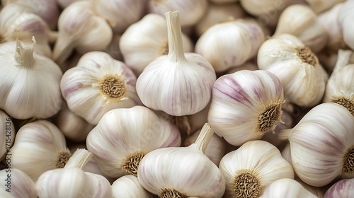 Closeup view of fresh white garlic bulbs with purple blush, stacked together tightly