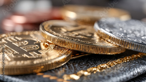 Close-up view of golden and silver bitcoin coins resting on a textured leather surface with a golden chain detail