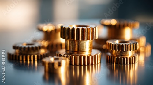 Close-up view of golden metal gears and cogs in various sizes with detailed textures on a reflective surface.
