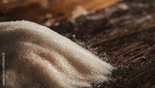 Close-up view of granulated sugar crystals on a wooden surface.