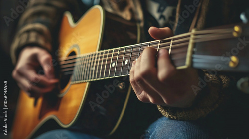 close-up view of hand playing guitar.ai generative