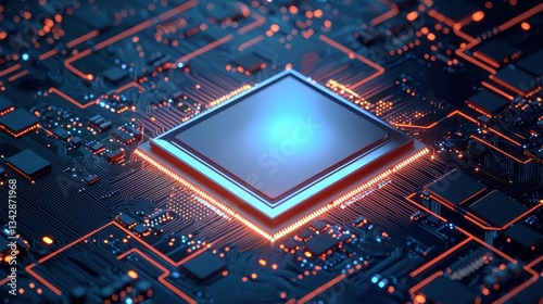 Close-Up View of High-Tech Microchip with Neon Circuitry Glow
