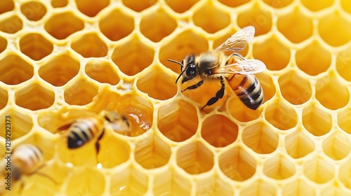 Close-up view of honeycomb with bees. Busy bees crawl through honeycomb cells collecting honey. Natural honeycomb pattern. Healthy food, nature concept. Perfect for beekeeping, apiary themes.