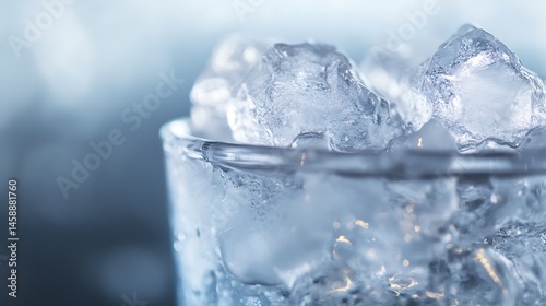 Close-up view of ice cubes in a glass, showcasing their translucent texture and crystalline structure. The cool, refreshing image evokes a sense of purity and coolness. : Generative AI