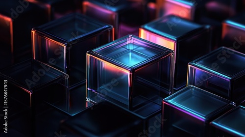 Close-up view of illuminated translucent cubes with reflective surfaces arranged in a grid pattern, showcasing vibrant blue, purple, and orange lighting effects in a dark environment