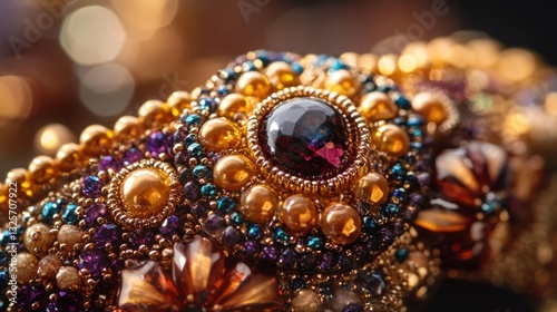 Close-Up View of Intricate Beaded Design Featuring Luxurious Gems and Rich Color Palette in Soft Focus Background for Artistic Display