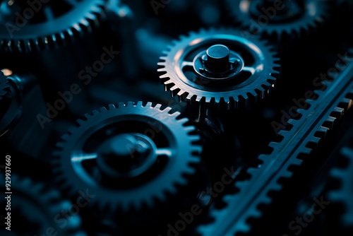 Close-up view of intricate metal gears in cool tones, showcasing mechanical precision and engineering design.