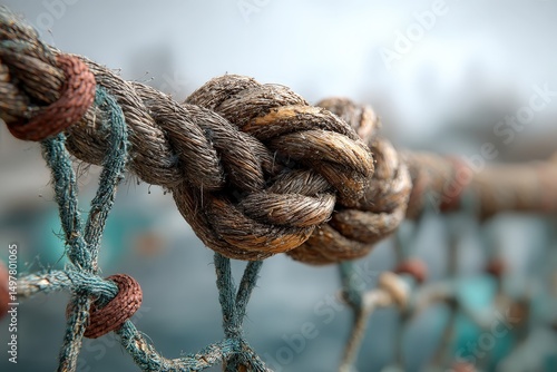 Close-up view of knot in a fishing net, showcasing texture and detail.