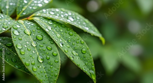 Close-up view of lush green leaves covered in glistening water droplets, showcasing a vibrant and refreshing natural scene.