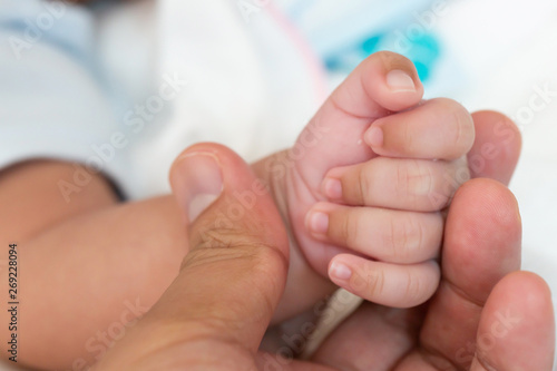 Closeup view of male hands hold the tiny newborn baby hand. Happy Family concept. Beautiful conceptual image of Maternity.