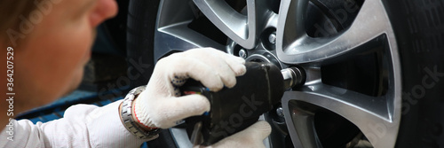Close-up view of male worker changing wheel on car. Service station diagnostic and repairing. Automobile maintenance concept. Machine garage and qualified assistance