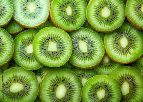 Close-up view of many fresh, juicy kiwi slices displaying vibrant green flesh with small black seeds and fuzzy brown skin in a tightly packed arrangement