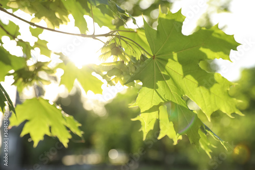 Closeup view of maple tree with young fresh green leaves outdoors on spring day