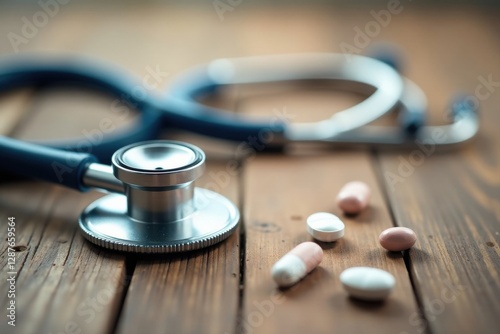 Close-up View of Medical Stethoscope and Assorted Pills on Rustic Wooden Surface