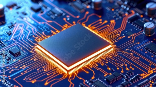 Close-Up View of Microprocessor on Circuit Board with Glowing Lines