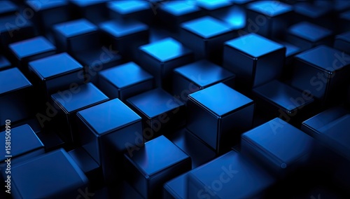 Close-up view of numerous dark-blue, glossy cubes tightly packed together, creating a dense, three-dimensional surface.