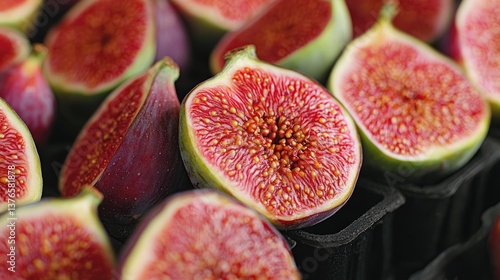 Close-up view of numerous ripe figs, halved and whole, showcasing their vibrant red interior and textured skin. They're neatly arranged in a dark container