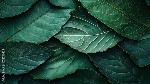 Close-up view of overlapping green leaves with detailed texture and intricate vein patterns, showcasing natural beauty and vivid colors.