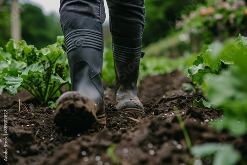 Close-up view of person walking through soil in black boots, emphasizing agricultural work.