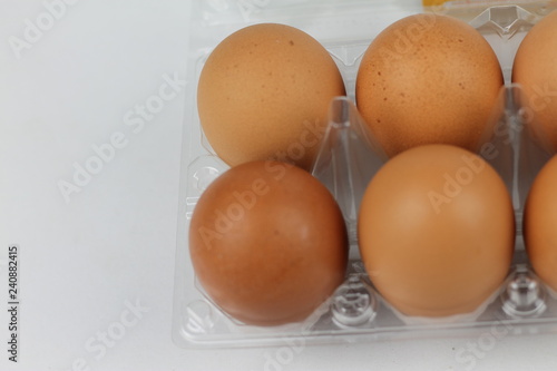 Close-up view of raw chicken eggs in egg box on white white background
