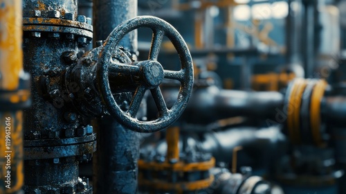 Close-up view of rusty industrial valve amidst interconnected pipes and machinery in a wet factory environment with drops of liquid