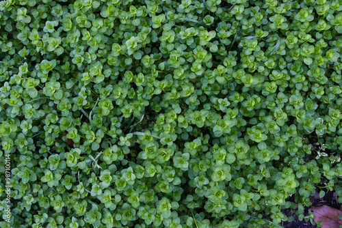 closeup view of small green leaves, sprout carpet wallpaper concept, nature background
