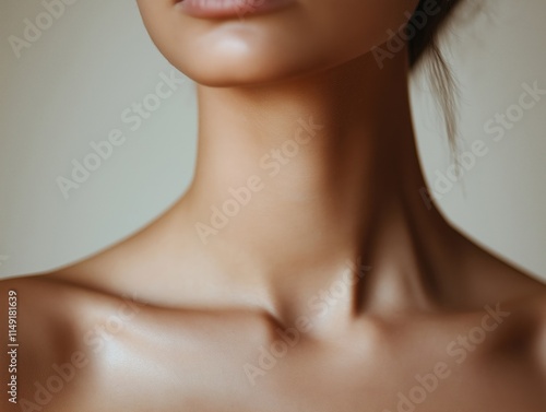 Close-up view of smooth elegant neck. Natural skin tones, contours highlighted. Soft lighting shows skin texture, warm tone. Image beautiful aesthetic detail of feminine body. Intimate portrait