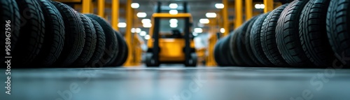 Close-up view of stacked tires in a warehouse, with a forklift in the background showcasing industrial storage and logistics.