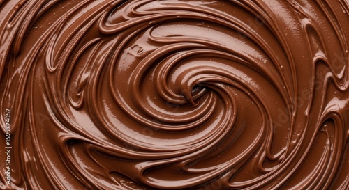 Close-up view of swirling, smooth, and rich chocolate spread, creating a delicious pattern.