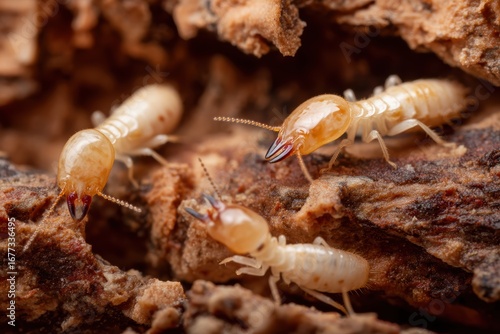 Close-up view of termites crawling on decaying wood, highlighting their pale bodies and intricate details