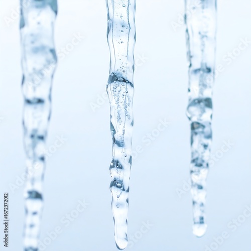 Close-up view of three icicles, showcasing intricate textures and translucent qualities against a pale blue backdrop.